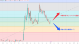 先週の振り返りとしては赤色のサポートライン(715万円)を割ったタイミングで一度撤退(利確or損切)、フィボナッチの節目から695万円で再エントリーで正解でしたね^^