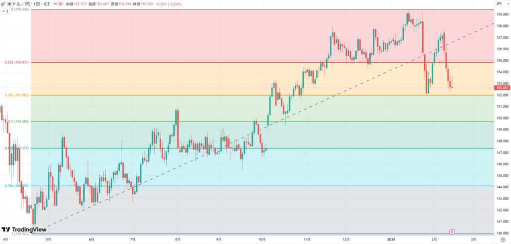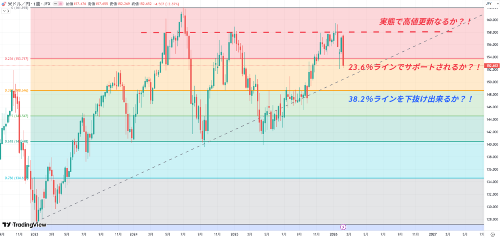 円安目線は2月として実態でフィボナッチ23.6%ラインでサポートされるかどうかを確認して買いエントリーといったところでしょうか。