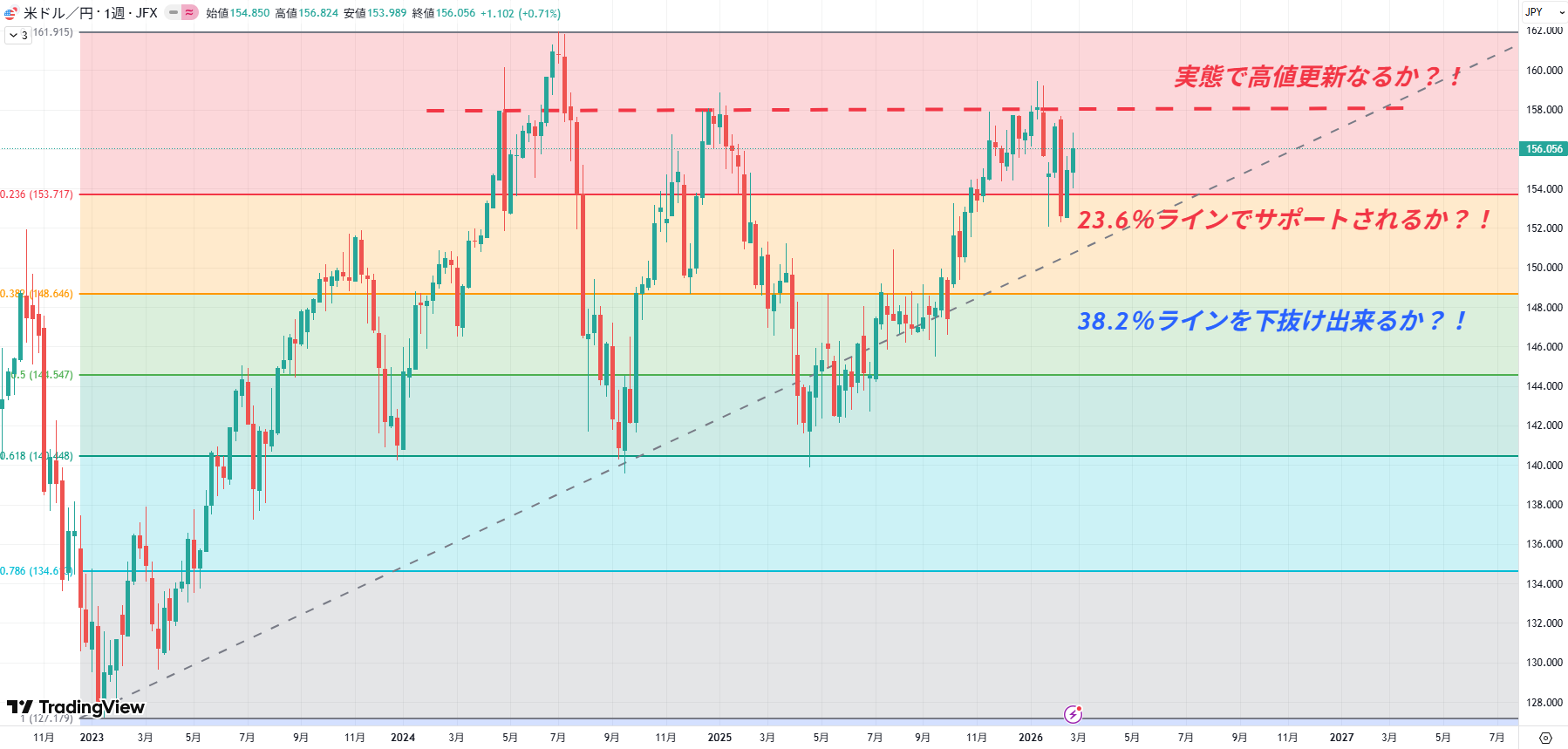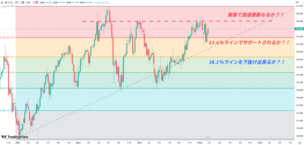 円高目線は3月として実態でフィボナッチ23.6%ライン下回れるかどうか。中長期的には実態でフィボナッチ38.2%ラインを切れるかどうか