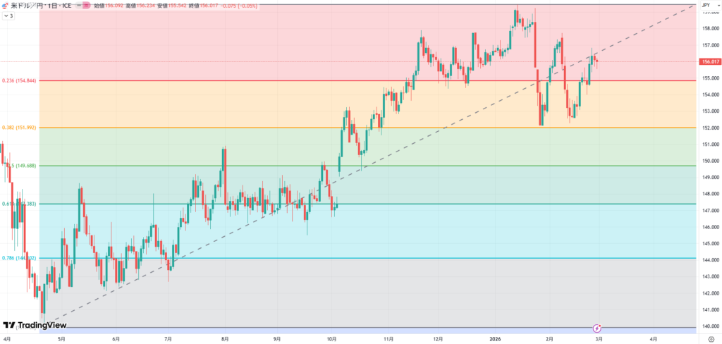 円安目線は3月として実態でフィボナッチ23.6%ラインでサポートされるかどうかを確認して買いエントリーといったところでしょうか。