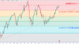 一方で、下げ方向に関しては週明け早々の動きであろうと以降の動きであろうとまずは直近の最安値を更新するかどうかがポイントになるので、下方向に関しては抜けてからのエントリーで十分かと思います。